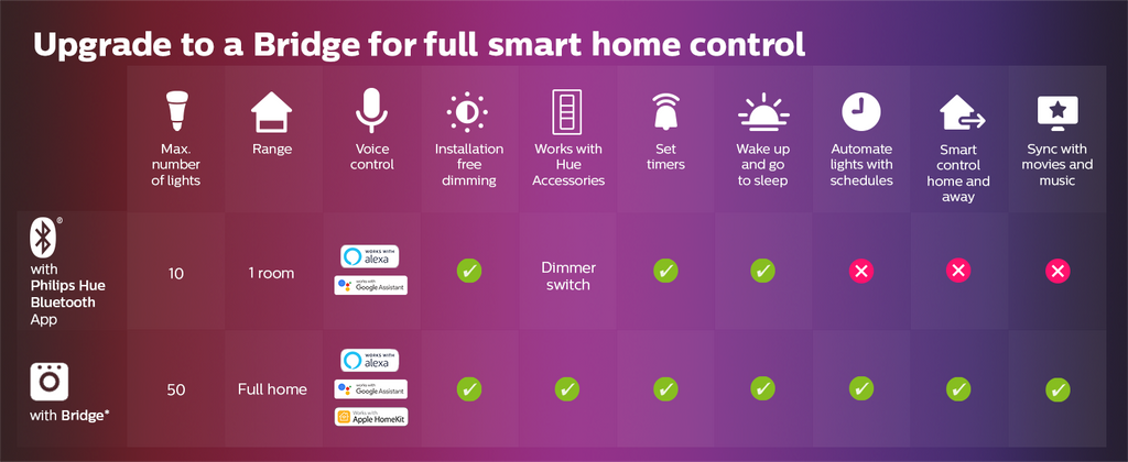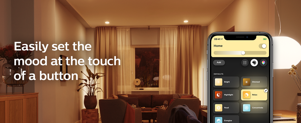 Upplev garanterat jämn dimring med Philips Hue, varken för ljust eller för mörkt. Ingen väggdimmer behöver installeras eller kablar behöver dras i hemmet.