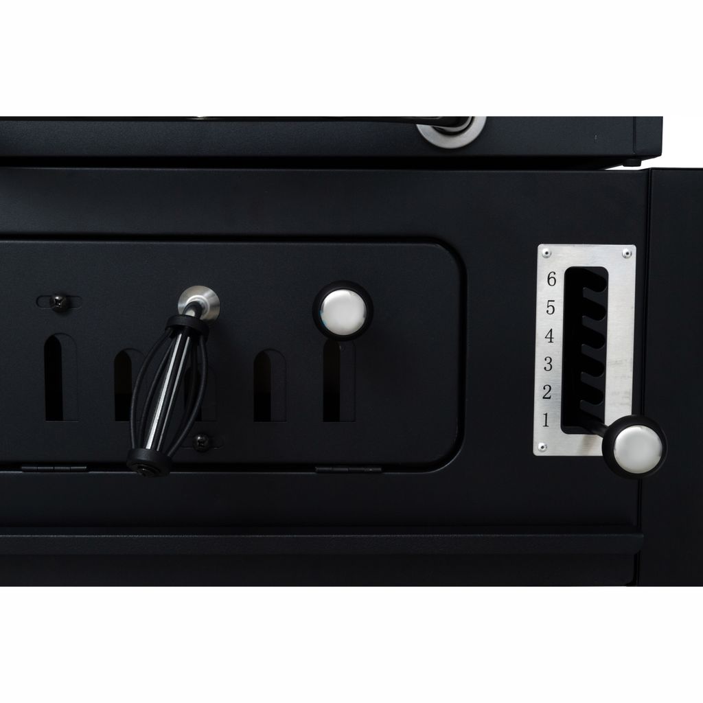 Byt ut de Multigrilltillbehör du vill ha på grillen, till exempel pizzasten, paellapanna eller gjutjärnsplancha, så kan du få ut det mesta av din grill. Grillens temperatur kan justeras med en spak, från vilken koltråget kan ställas på 6 olika höjder för att justera effekten. Framtill på grillen finns en stor lucka, genom vilken du kan lägga till kol under grillning och ta bort askan när den svalnat.