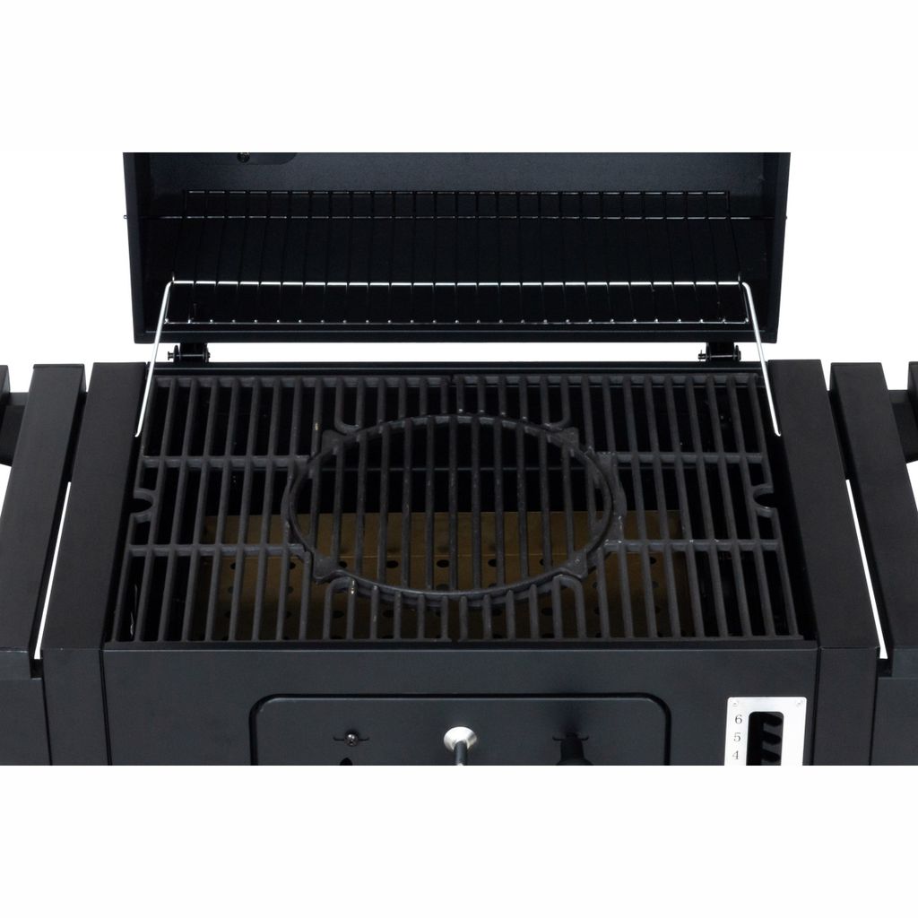 Ett värmegaller med vilket du ökar grillytan eller håller de färdiga produkterna varma. Stor och djup kolkorg, vars höjd kan justeras i 6 olika höjder. Framtill på grillen finns en stor lucka, genom vilken du kan lägga till kol vid under grillning och ta bort askan när den svalnat.