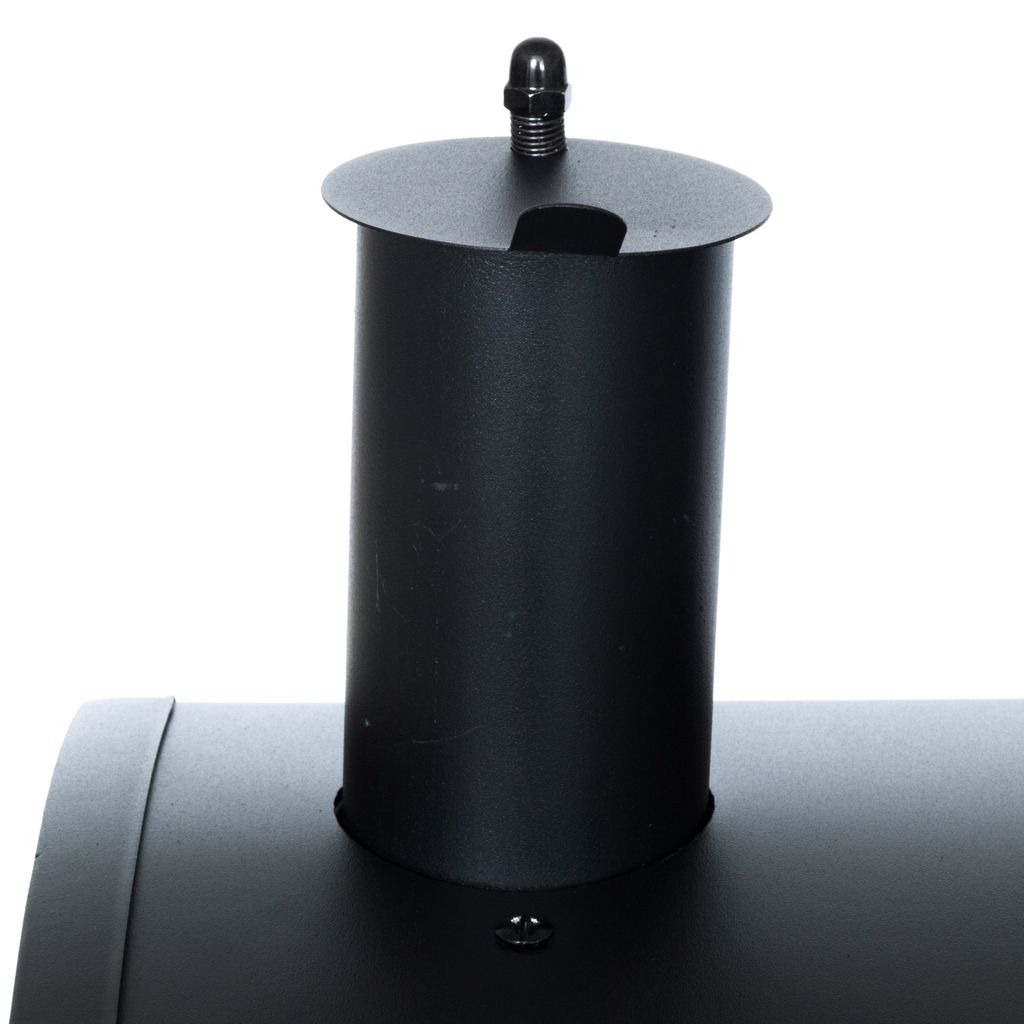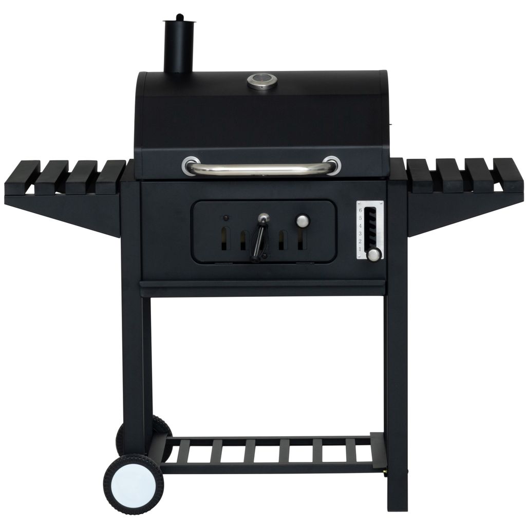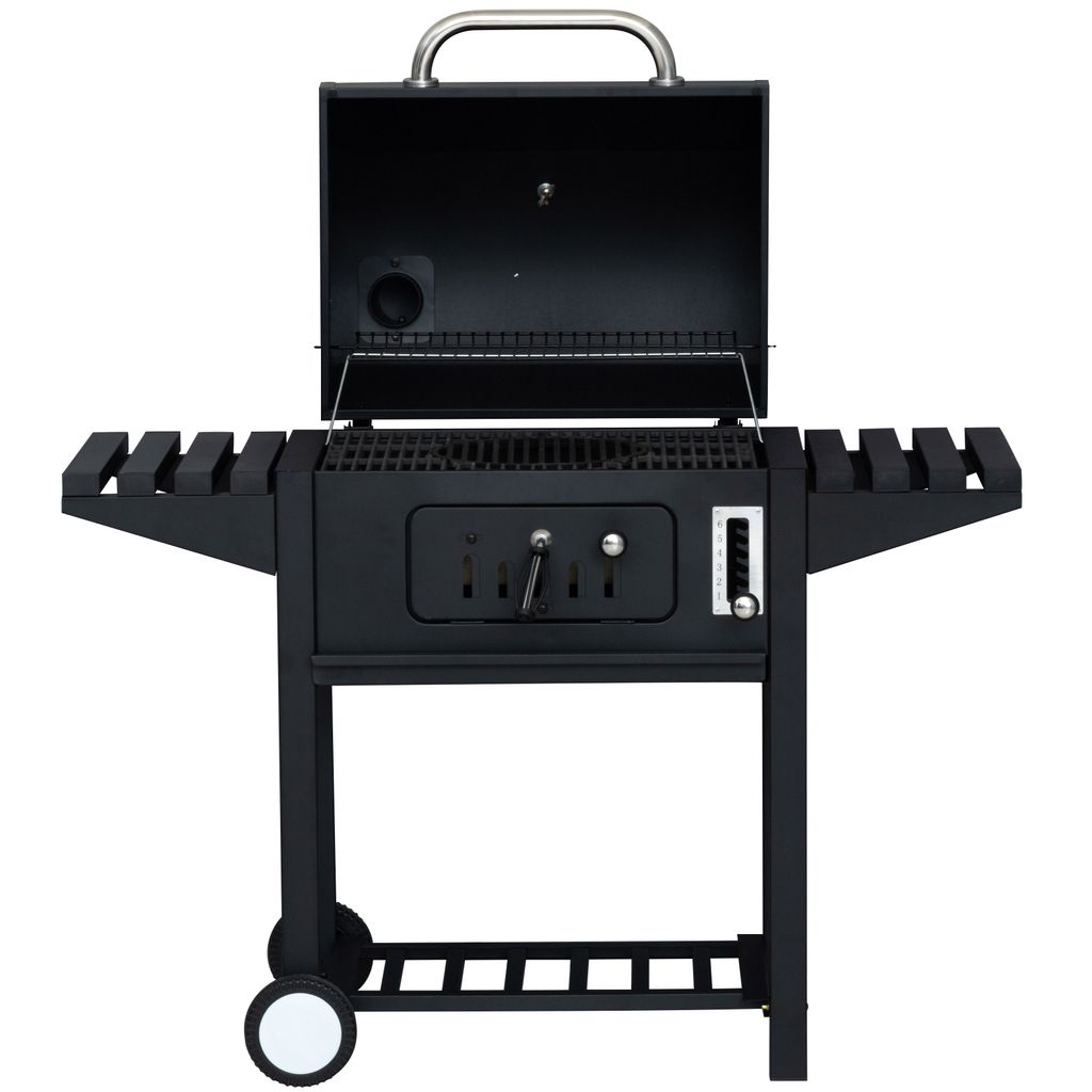 Spjäll i skorstenen för att justera draget när locket är stängt. Det förhindrar också att regnvatten tränger in i grillen. Termometer i locket. Stadig vagn och sidobord. 2 stora hjul för flyttning.