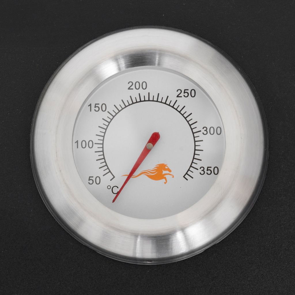 Skorsten med spjäll i locket för att justera draget när locket är stängt. Termometer i locket. Stadig vagn och sidobord. 2 stora hjul för enkel förflyttning. Askuppsamlingsplåt för enkel rengöring.