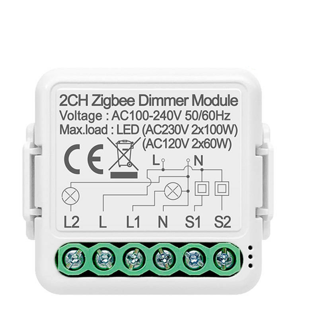 Avatto 2CH Dimmer module är en universaldimmer med två utgångar. De två utgångarna kan användas fristående och kopplas till separata knappar.