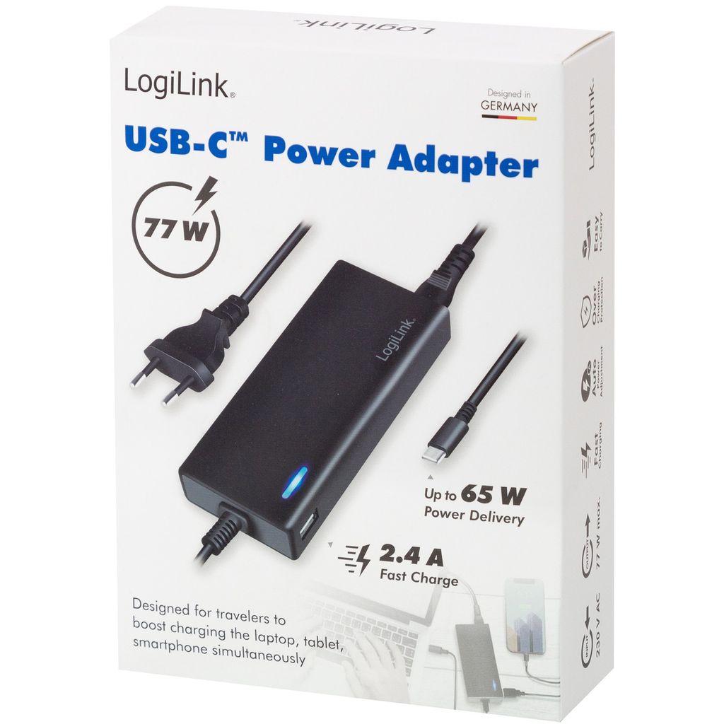 LogiLink USB-C-laddare för 2 enheter, 1x USB-C PD & USB-A max 77 W
