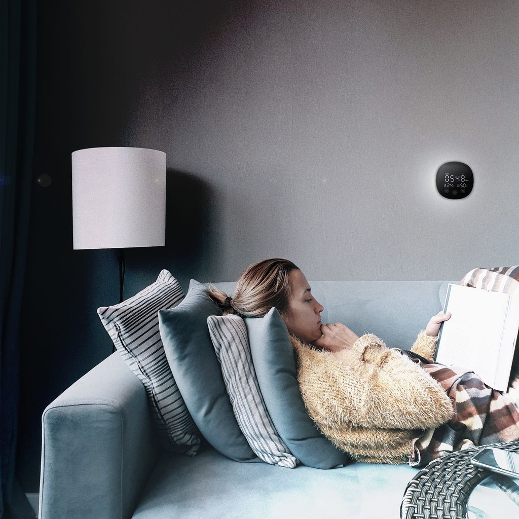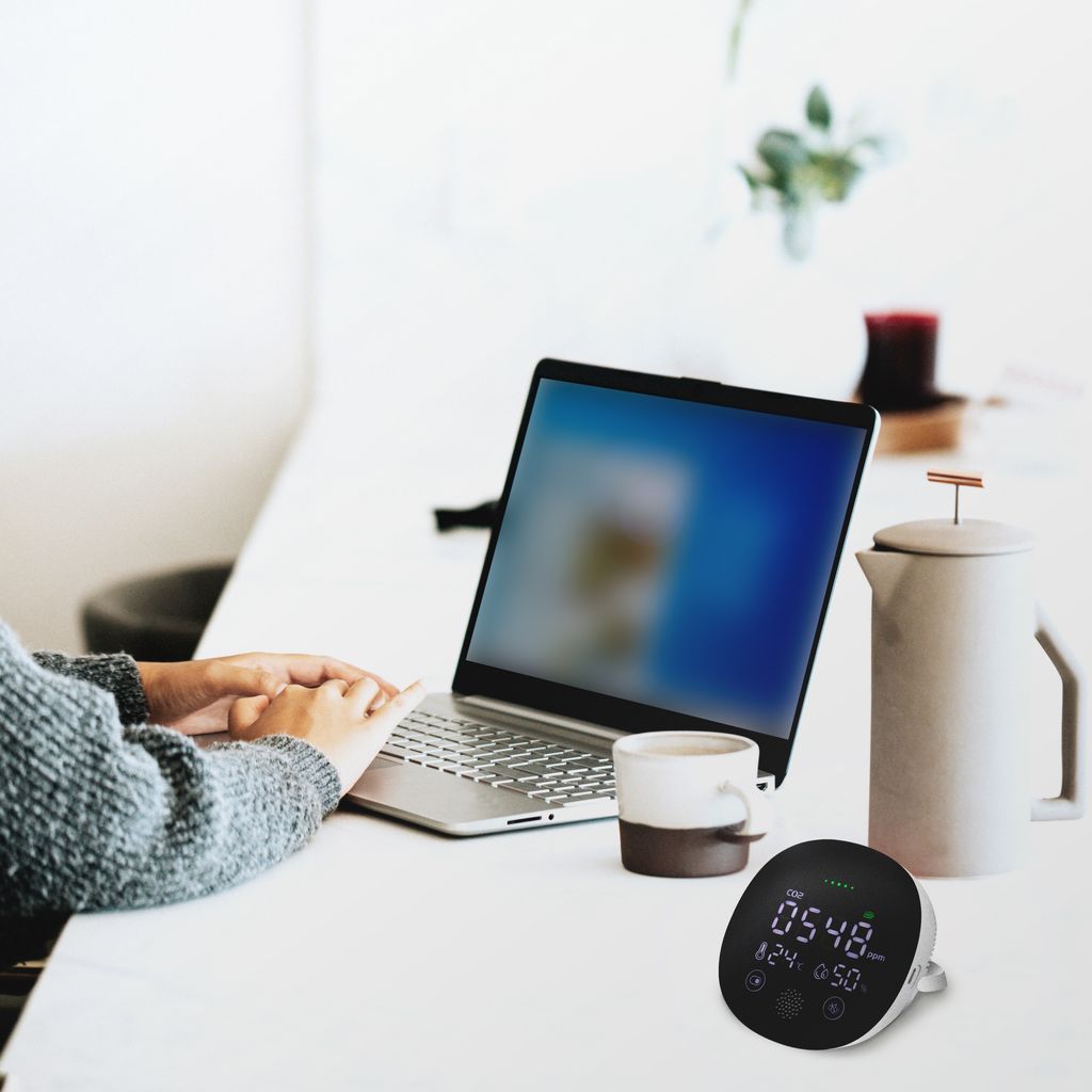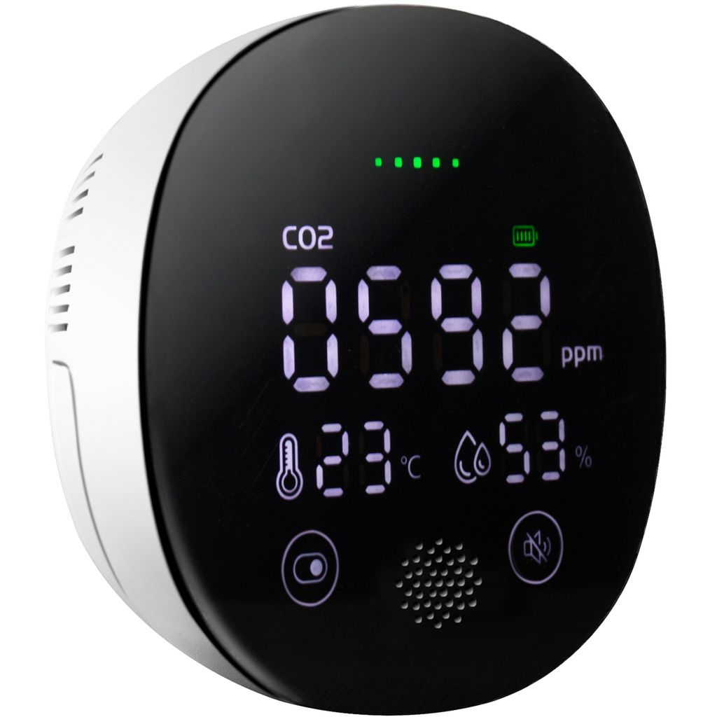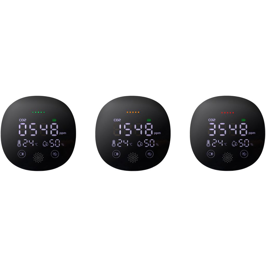 Få ljud- och visuella larm när koncentrationsnivåerna går över 1600 ppm. Den visuella larm-LED-indikatorn visar luftkvalitetsnivåer i realtid (grön=bra, gul=försiktighet, röd=dålig).
