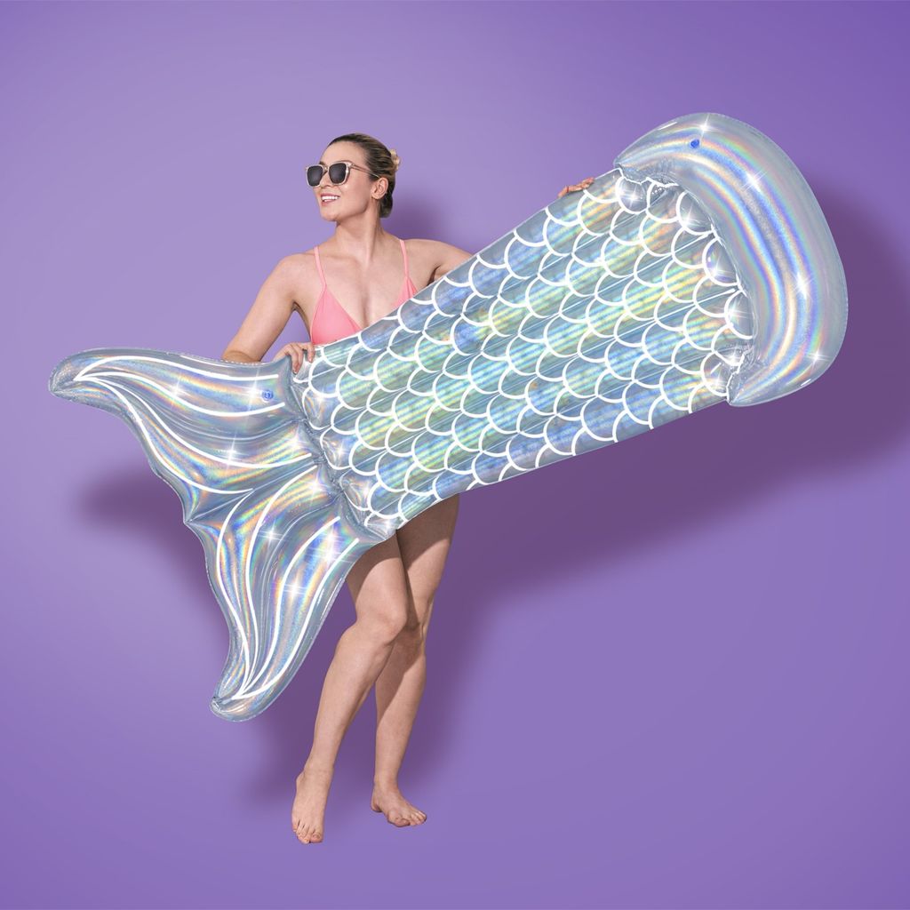 Med sitt glansiga, regnbågsskimrande material och unika design av en sjöjungfru, kommer du vara mittpunkten på ditt poolparty.