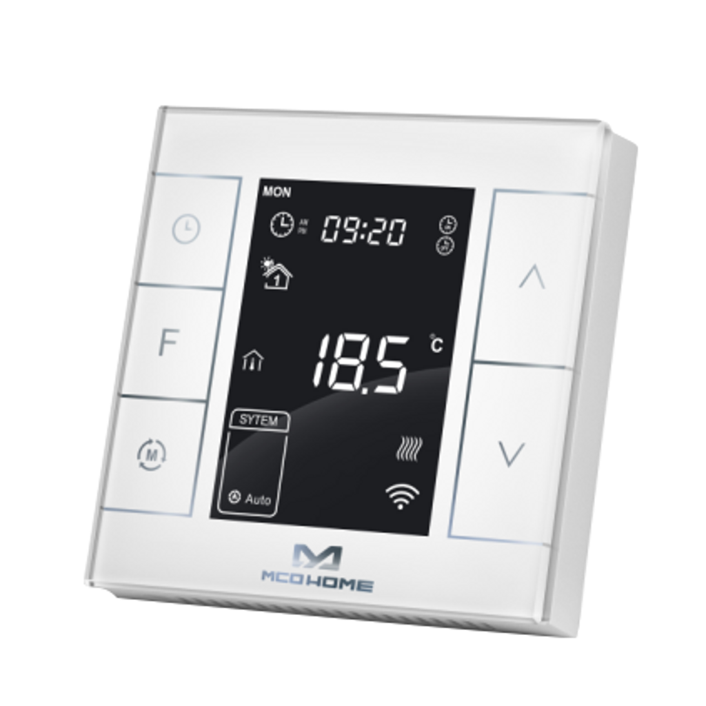The wall thermostat MCOEMH7H-WH2 requires an installation with permanent mains power. Thanks to its modern design with capacitive glass touch panel it is particularly suited for visible installation in living areas. With the modern designed glass touch thermostats by MCO you can control various heating and cooling systems – e.g. heating cable, heating film, water valve, electrical valve, boiler, fan coil, solar energy controller, heat pump, ventilation system etc.