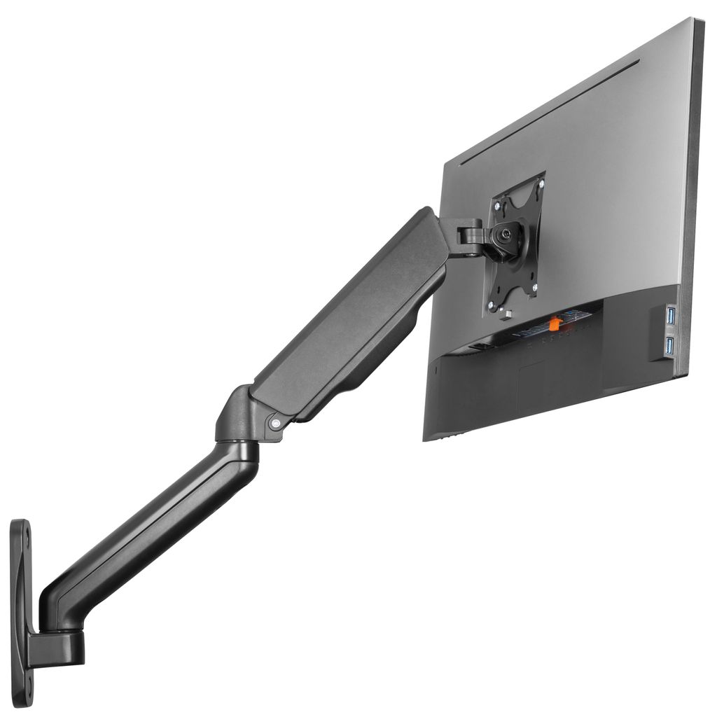 Väggfäste med gasfjäder för bildskärm frigör både yta på skrivbordet och ökar arbetskomforten. Inbyggda gasfjädrar för smidig rörelse; konstruerad av slitstarkt stål och aluminium har stöd för skärmvikter upp till 9 kg per arm.