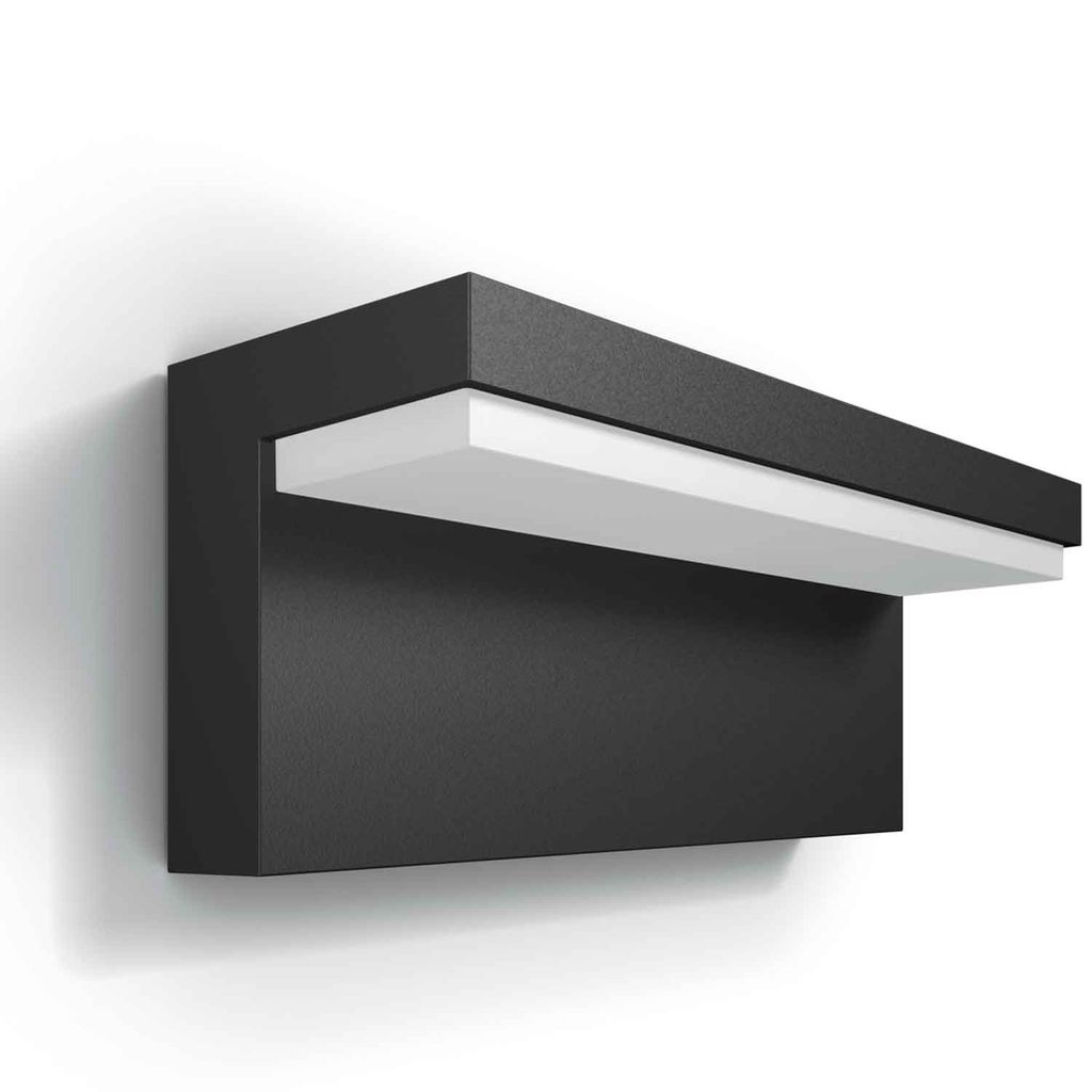 En vacker L-formad lampa. Den minimalistiska vägglampan Philips Bustan i förstklassigt antracitgrått aluminium avger ett spritt, varmvitt LED-ljus på väggen.