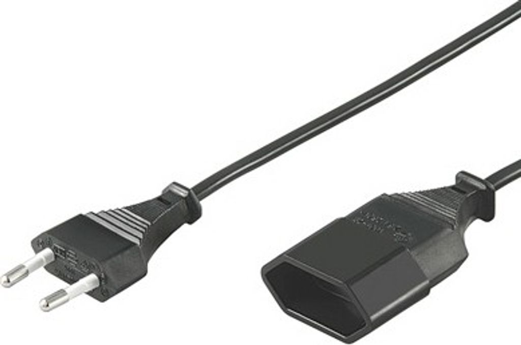 Produktbeskrivning DELTACO ojordad apparatkabel för förlängning mellan enhet och vägguttag, rak CEE 7/16 till rak IEC 60906-1, max 250V/2,5A, 5m, svart