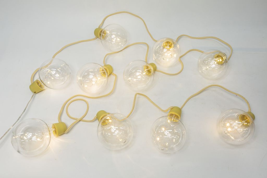 Denna IP44-klassade partyslinga består av 10 plastlampor med 3 LED-ljuspunkter per lampa och en exklusiv textilkabel. Slingan levereras med transformator och är perfekt för både inomhus- och utomhusmiljöer.