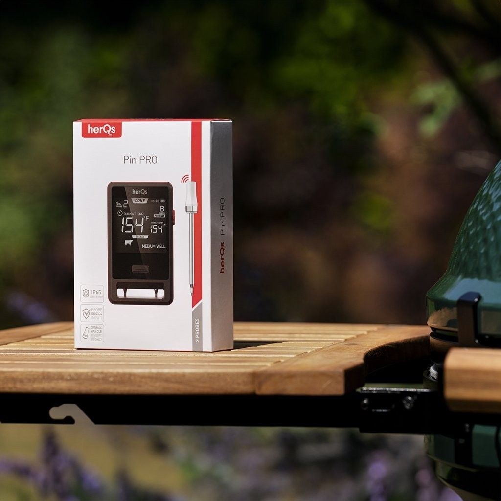 HerQs Pin PRO är en avancerad, trådlös köttermometer som förenklar matlagningen genom exakt temperaturövervakning och fjärrstyrning via en kostnadsfri app.