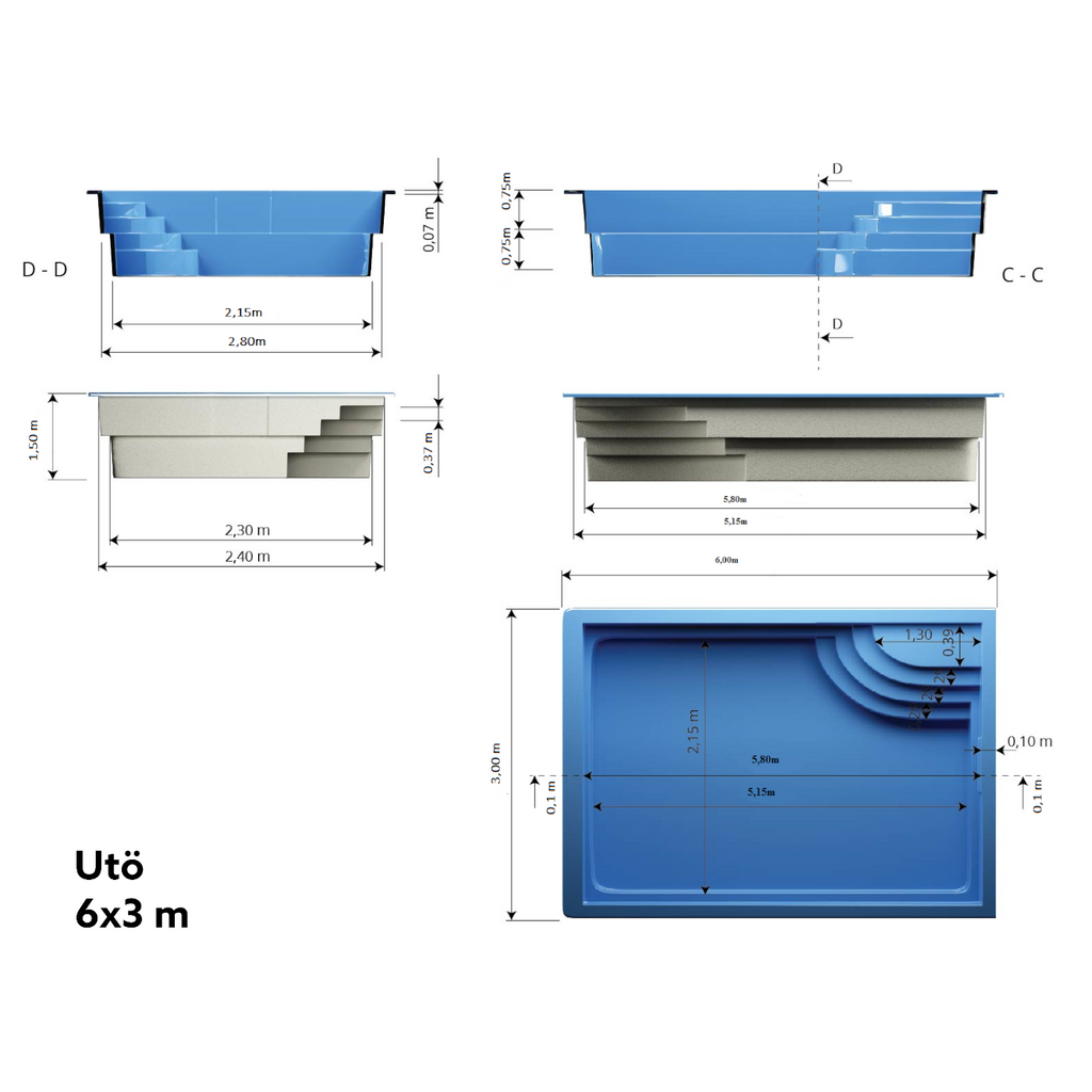Glasfiberpool Utö är en modern pool med en lång rundad hörntrapp planerad i höger hörn. Den stora härliga hörntrappan ger en härlig sittplats på det översta trappsteget där du kan njuta av solen. Den runda hörntrappan som är placerad i hörnet ger möjligheten att kunna få bra simmyta på kortsidan där du kan simma längder i poolen utan att störas av hinder.