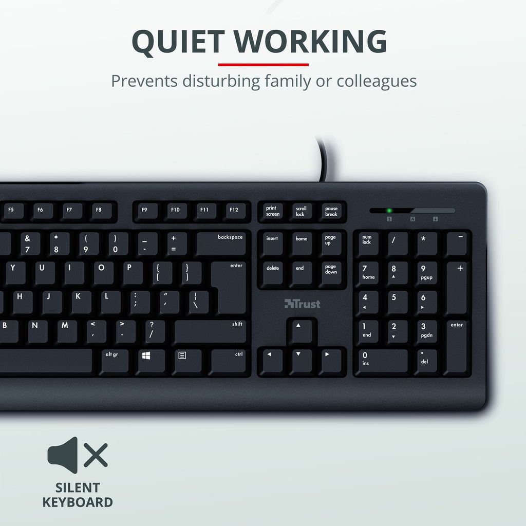 Tangentbord i full-size med tysta tangenter och spilltålig design