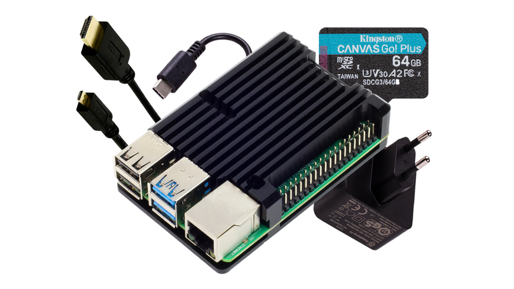 Vårt egna paket med Raspberry Pi 4GB och allt du behöver för att komma igång!- Raspberry Pi 4 4GB- Pimoroni passivt kylt aluminium-case- Officiell Raspberry Pi USB-C laddare- Kingston 64GB minneskort- Micro-HDMI till HDMI-kabel