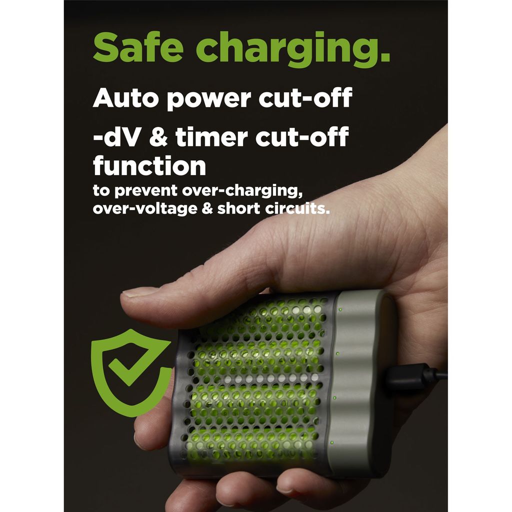 En elegant och snabb batteriladdare med smarta säkerhets- och tekniska funktioner som kan ladda upp till fyra AA- eller AAA-batterier samtidigt. Med sitt perforerade skydd fungerar den även som ett stiligt batterifodral, vilket håller dina batterier skyddade hemma eller när du är på språng.