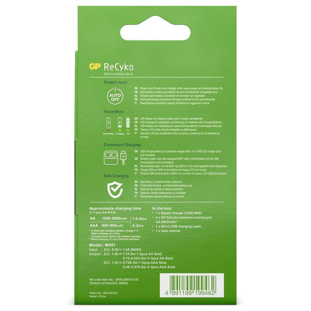 Denna mångsidiga laddare fungerar med USB eller valfri GP ReCyko laddstation (speciellt utvecklad för ReCyko-laddmodeller B421, M451 och P461). Med fyra laddningsbara 2600mAh AA-batterier inkluderade så är allt klart för att sätta igång med denna optimala laddlösning.