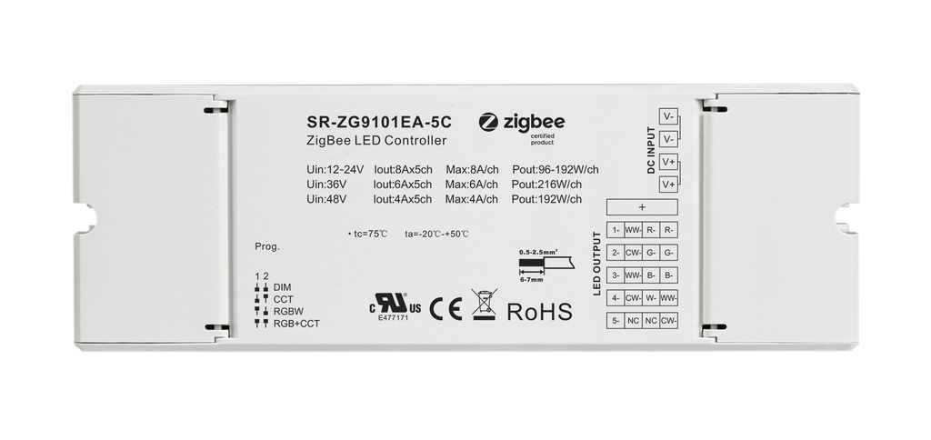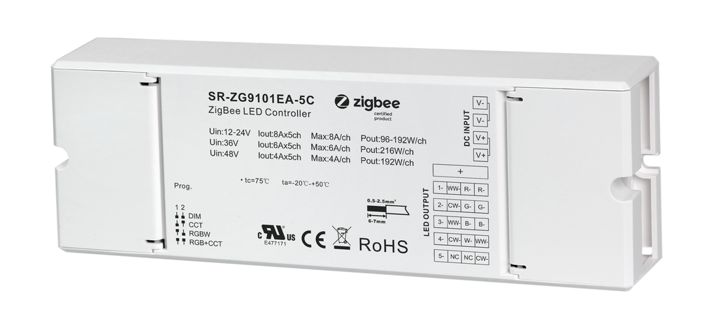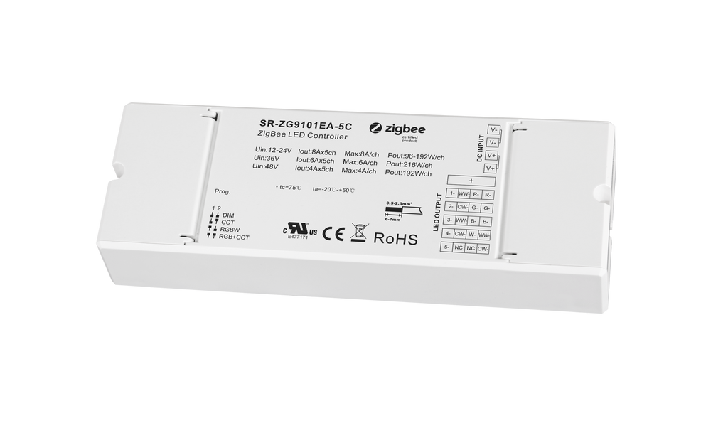 SR-ZG9101EA-5C is a zigbee 3.0 based 4 in 1 LED lighting device with 5 channels output which can control RGB+CCT, RGBW, tunable white, single color LED lights, the device can search and pair to Zigbee network and be controlled from your controller or hub interface. Internet remote control option via smart phone, computer or tablet extends your control convenience. The Zigbee LED dimmer can be compatible with universal Zigbee gateways or coordinators. It can directly pair to zigbee remotes through touchlink commission. In addition, once compatible Zigbee remotes are added to the same network, they can bind to and be controlled by the remotes.