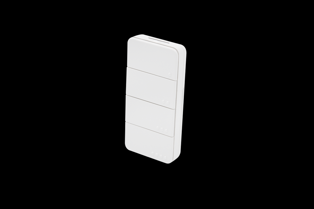 Shelly BLU RC Button 4 är en liten fjärrkontroll med fyra knappar som enkelt kan ställas in för att styra dina lampor, gardiner, garageporten, dina belysningsscener eller något helt annat. Fjärrkontrollen levereras med en hållare och ram som enkelt kan skruvas på väggen. Själva fjärrkontrollen har en magnetisk baksida, så den kan tas ur hållaren och placeras på soffbordet eller nattduksbordet.