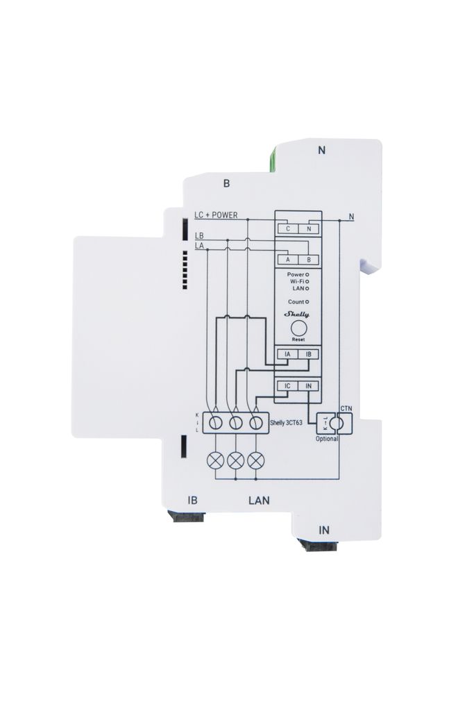 Shelly Pro3 EM CT63 är en trefas energimätare som använder strömtransformatorer för att mäta energidata på tre individuella faser med belastningar på upp till 63A och med 99 % noggrannhet.