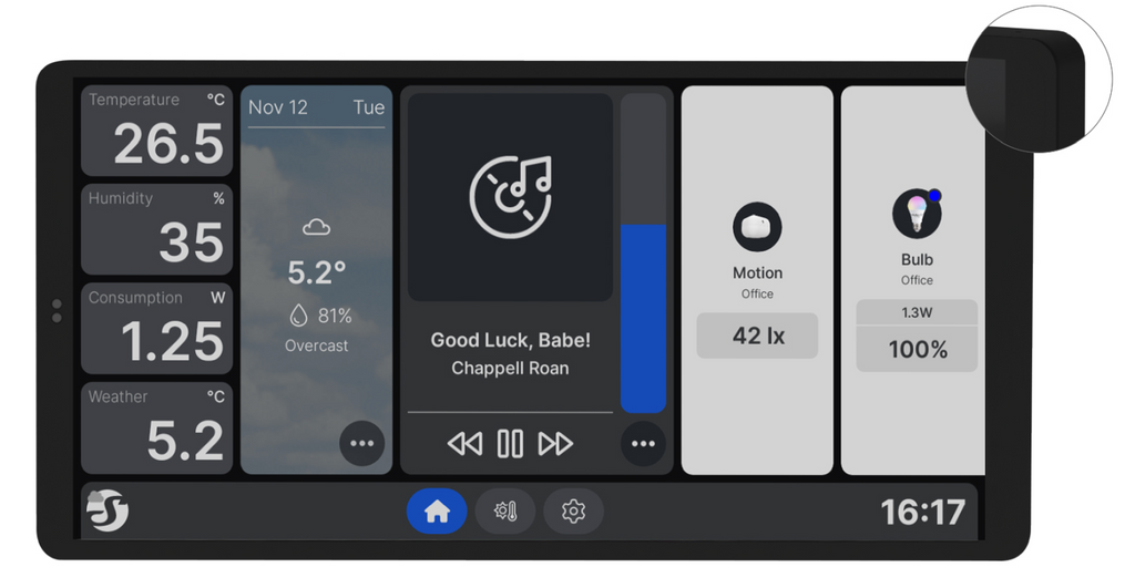 På enhetens hemskärm får du snabb tillgång till dina favoritapparater och scener. Shelly Wall Display låter dig dessutom styra Bluetooth- och Sonos-högtalare samt använda den inbyggda termostaten för att reglera rummets temperatur. Skärmen visar även aktuell energiförbrukning, temperatur och luftfuktighet i rummet.