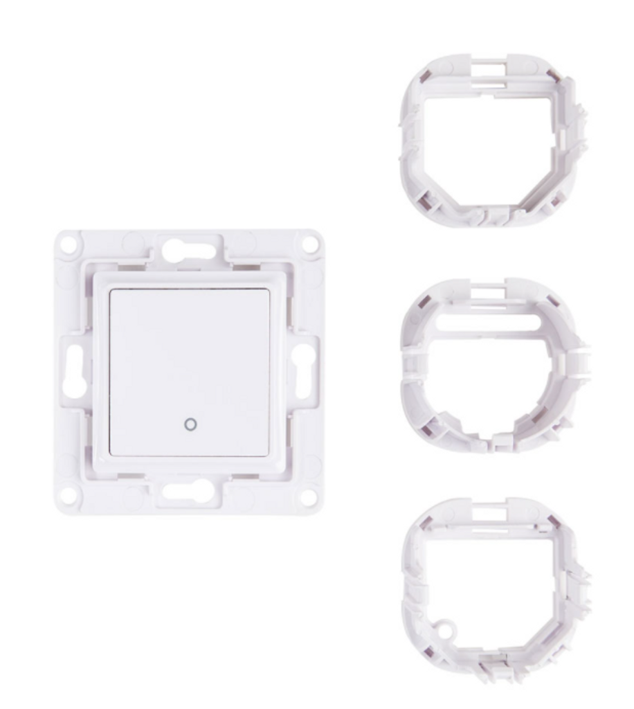 Shelly Wall Switch finns i tre varianter: - 1 knapp (svart och vit) - 2 knappar (svart och vit) - 4 knappar (svart och vit) Knapparna är helt platta på baksidan och levereras med en hållare som enkelt klickas på baksidan för att fästa Shelly reläer och dimmers, vilket gör knapparna intelligenta. Ram måste köpas separat.