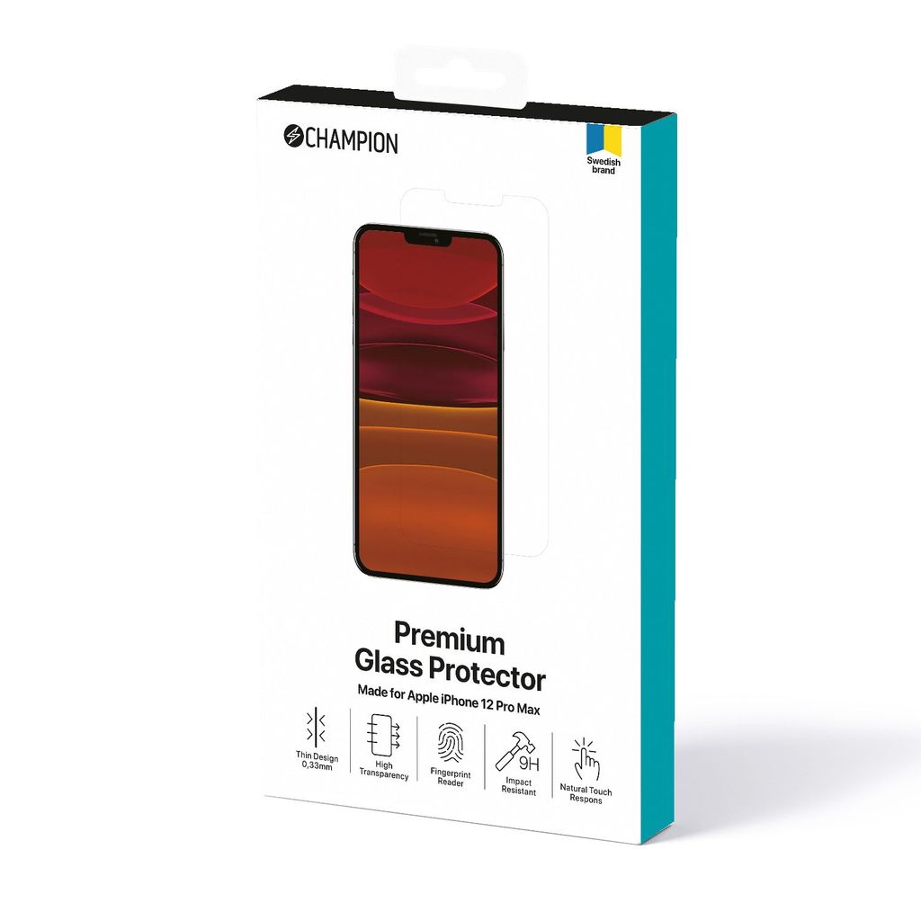 Champion premium skärmskydd i härdat glas håller din iPhone 12 Max Pro i optimalt skick. Glaset har en oleophobisk yta vilket förhindrar olja från fingrarna att fastan på skärmen. Den reptåliga ytan blockerar UV-strålning vilket skyddar dina ögon samt gör din telefons skärm betydligt mer tålig.