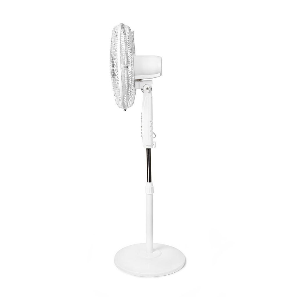 Fläkt med en diameter på 40 cm som kan vinklas och justeras i höjdled manuellt för perfekt luftflöde och har ett viloläge som sänker hastigheten stegvis innan den stängs av.