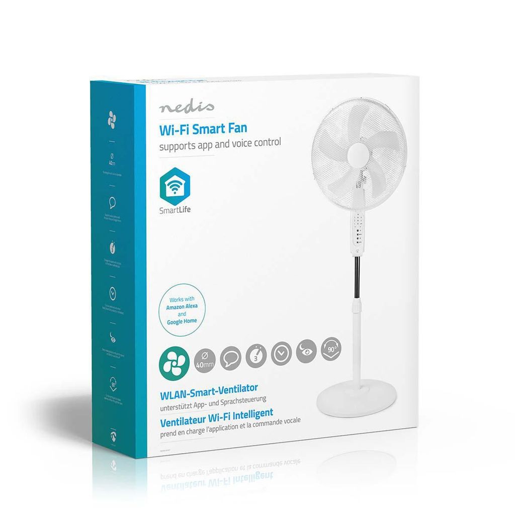 Smart Wi-Fi-fläkt stativ, diameter 40 cm.Styr din smarta fläkt med telefonen och Nedis SmartLife-app (iPhone och Android) eller med rösten via Google Home eller Amazon Alexa. Ändra hastighet, riktning och ställ in timer eller scheman.Fläkten har ett viloläge som stegvis sänker hastigheten innan den stängs av automatiskt.Ansluts direkt till din wifi-router.