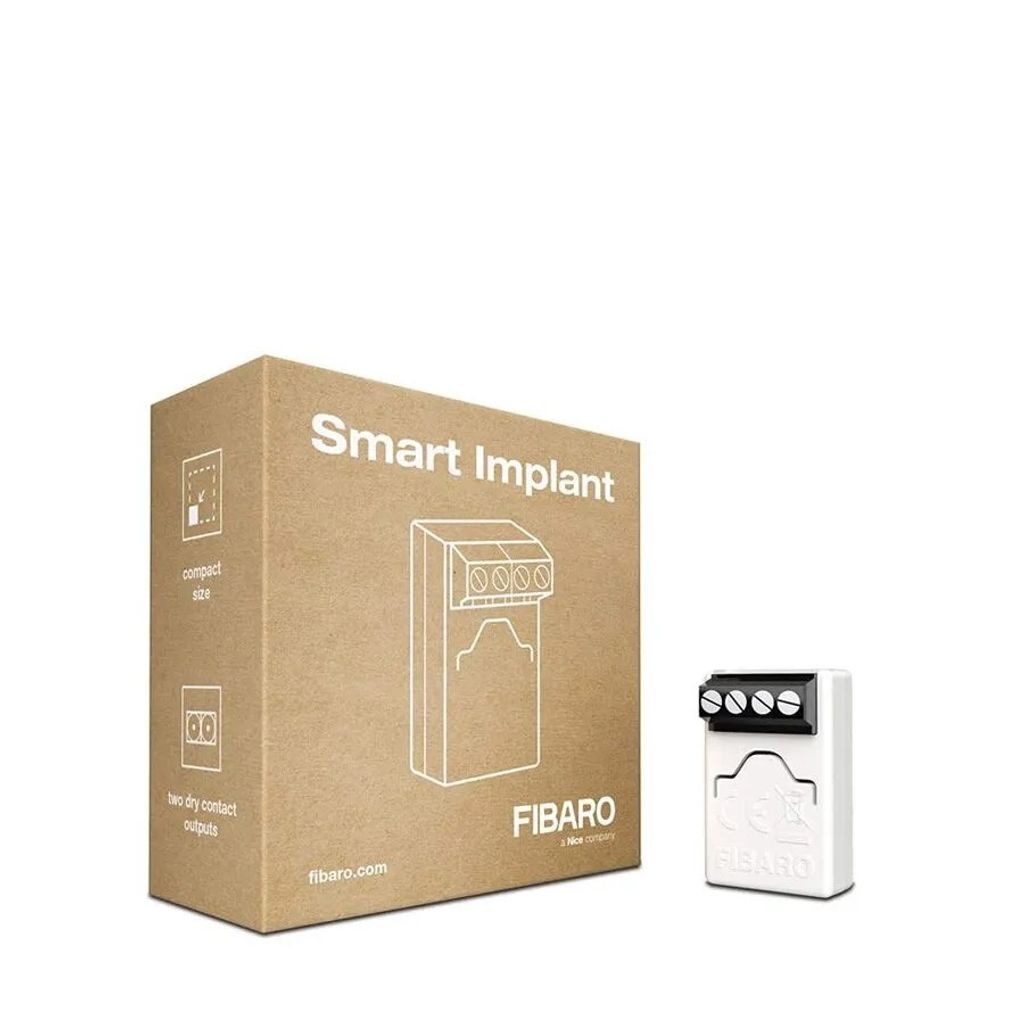 Fibaros Smart implant är en vidareutveckling av Fibaros universalsensor. Den kan styra anslutna enheter, kan användas för att styra scener, koppla in temperatursensorer till och är kompatibel med binära sensorer. Förutom att styra enheter (ON/OFF), läser Smart implant sensordata och förlänger Z-wave-nätverket.