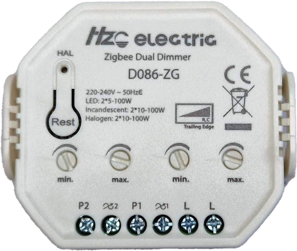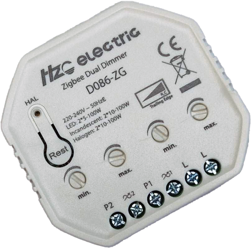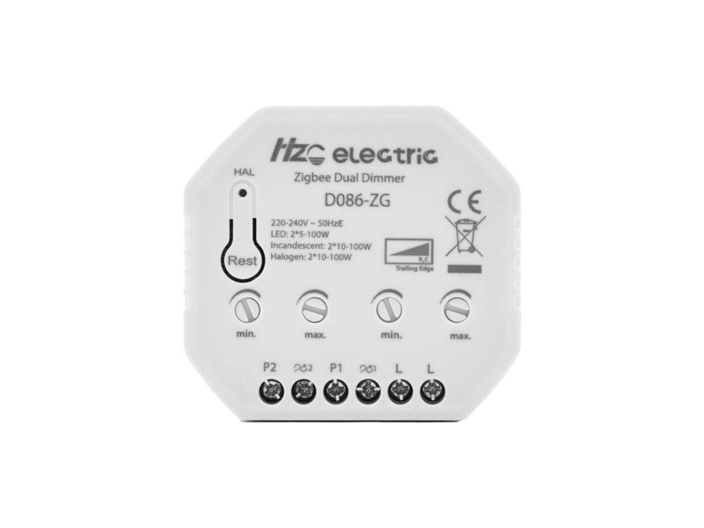 HZC Dual Dimmer är en universaldimmer med två utgångar. De två utgångarna kan användas fristående och kopplas till separata knappar.