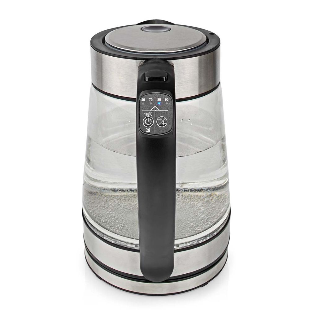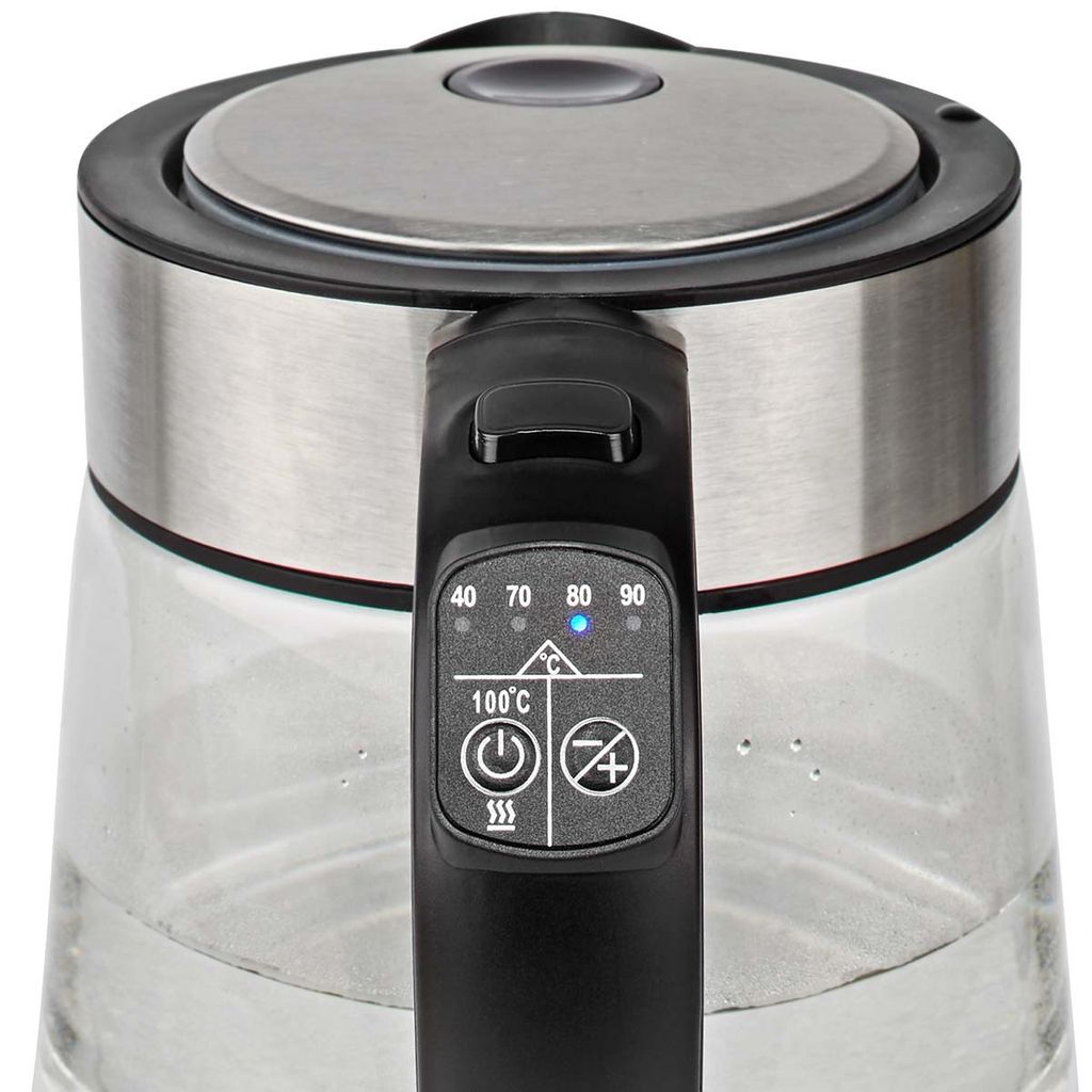Temperaturen kan ställas in på 10-gradersintervall från 40 till 100 °C när du vill brygga en perfekt kopp te. Den aktuella temperaturen visas både i appen och på vattenkokarens skärm. Blå belysning tänds när vattenkokaren slås på och en ljudsignal samt ett pushmeddelande talar om att önskad temperatur har uppnåtts. Glaskannan som har detaljer i rostfritt stål rymmer upp till 1.7 l vatten och har tidlös design som passar in i varje kök eller kontor. Det löstagbara antikalkfiltret minskar kalkmängden i dryckerna. Basen i rostfritt stål är minimalistisk och den kan rotera vattenkokaren 360 grader.