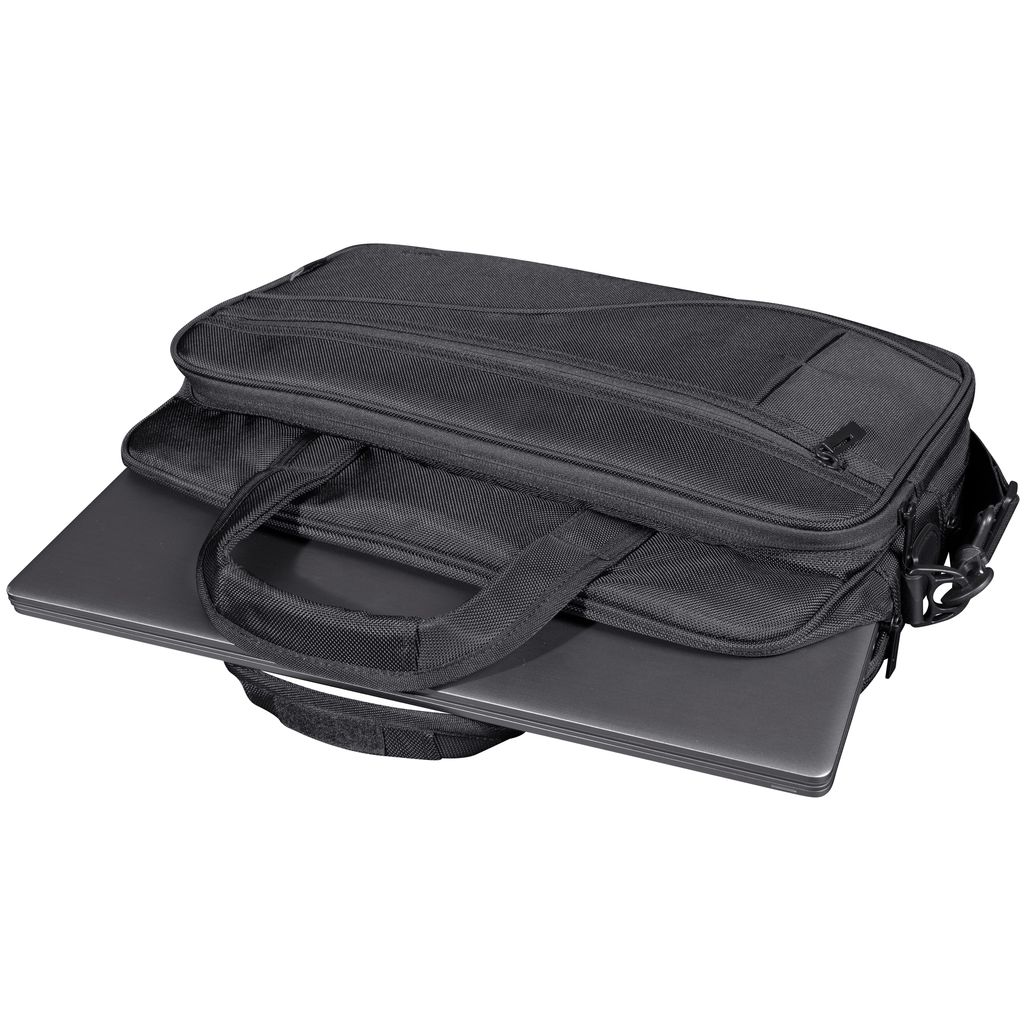 Top-loader-designen ger enkel åtkomst till din bärbara dator och dokument. Huvudfacket har vadderat skydd som förhindrar stötar och repor, medan tre separata fack för t.ex. tillbehör kan stängas med en dragkedja. Väskan är försedd med slitstarka metallöglor, krokar och dragkedjor, samt gummifötter på undersidan skyddar mot repor.