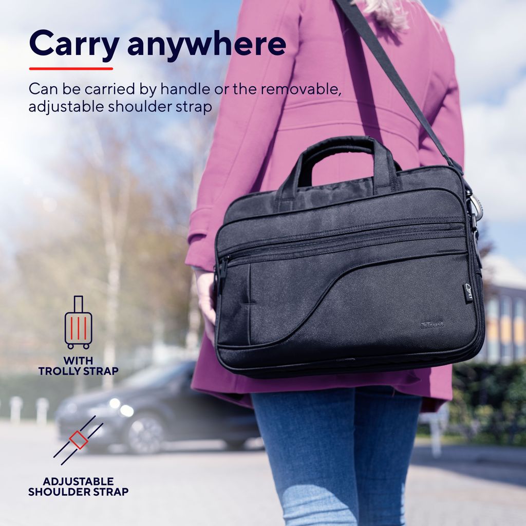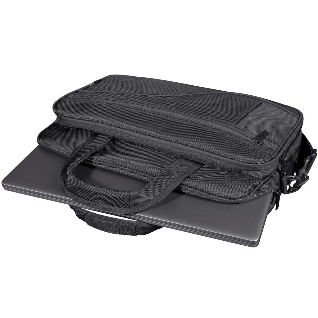 Top-loader-designen ger enkel åtkomst till din bärbara dator och dokument. Huvudfacket har vadderat skydd som förhindrar stötar och repor, medan tre separata fack för t.ex. tillbehör kan stängas med en dragkedja. Väskan är försedd med slitstarka metallöglor, krokar och dragkedjor, samt gummifötter på undersidan skyddar mot repor.