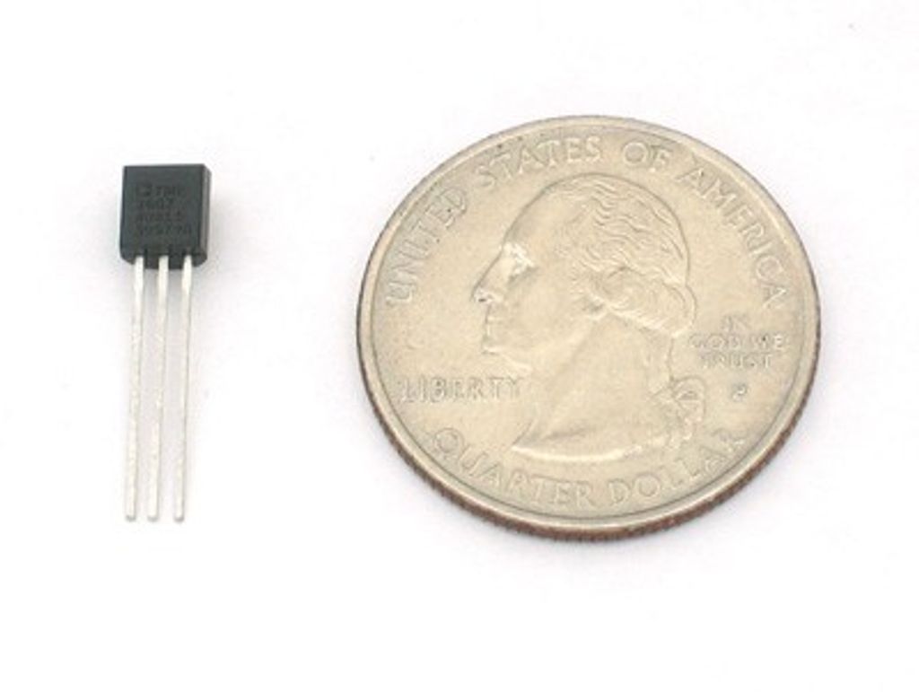 Wide range, low power temperature sensor outputs an analog voltage that is proportional to the ambient temperature. To use, connect pin 1 (left) to power (between 2.7 and 5.5V), pin 3 (right) to ground, and pin 2 to analog in on your microcontroller. The voltage out is 0V at -50°C and 1.75V at 125°C. You can easily calculate the temperature from the voltage in millivolts: **Temp °C = 100*(reading in V) - 50**.