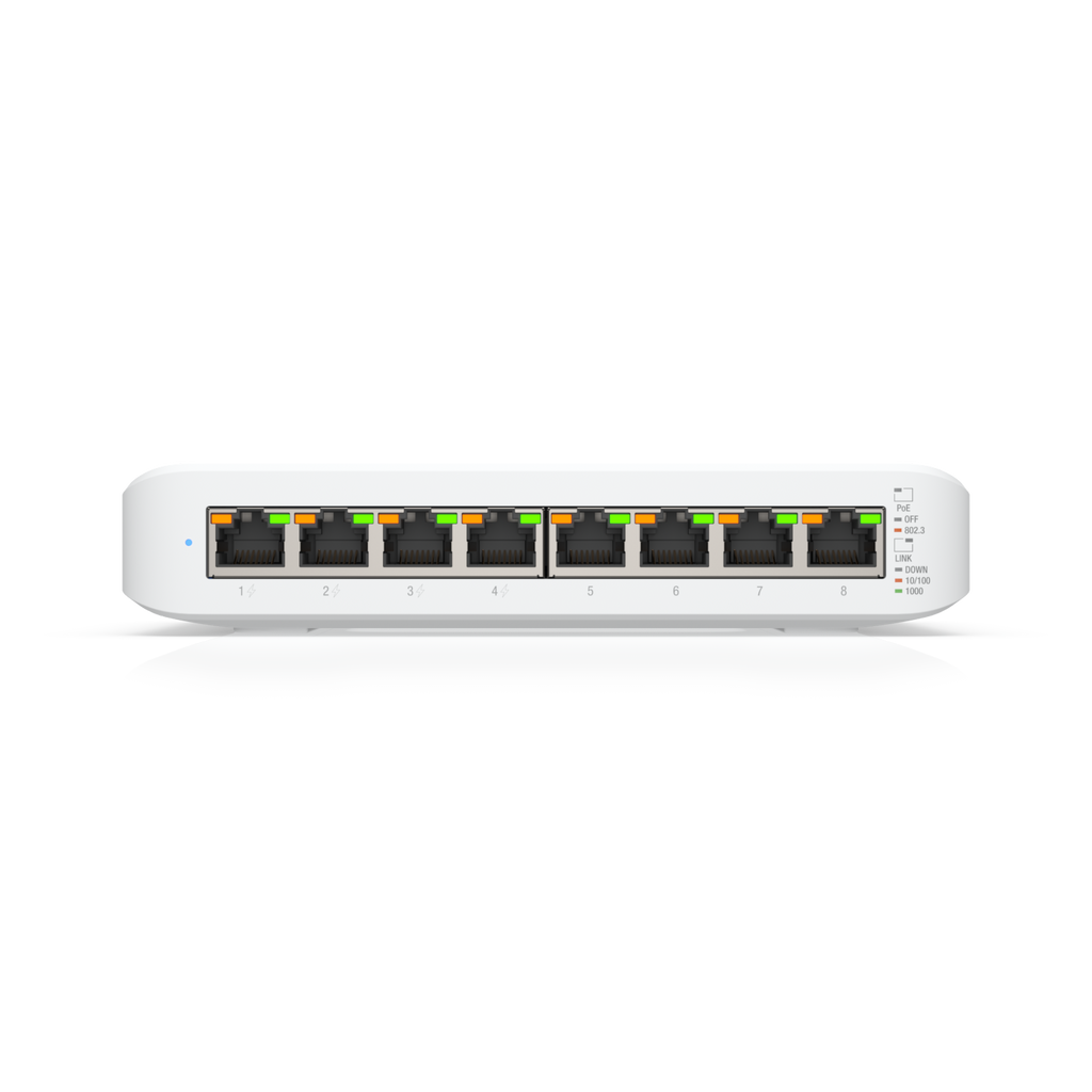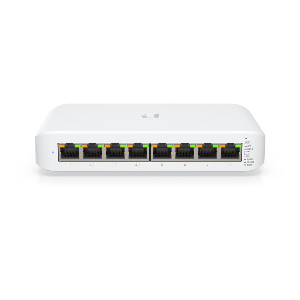 Ubiquiti UniFi Switch Lite 8 PoE är en kompakt Layer 2-switch med åtta Gigabit RJ45-portar, varav fyra stöder PoE+ (802.3at). Med en total PoE-budget på 52W och fläktlös design är den idealisk för små till medelstora nätverk som kräver tyst drift och effektiv strömförsörjning till enheter som accesspunkter och IP-kameror.