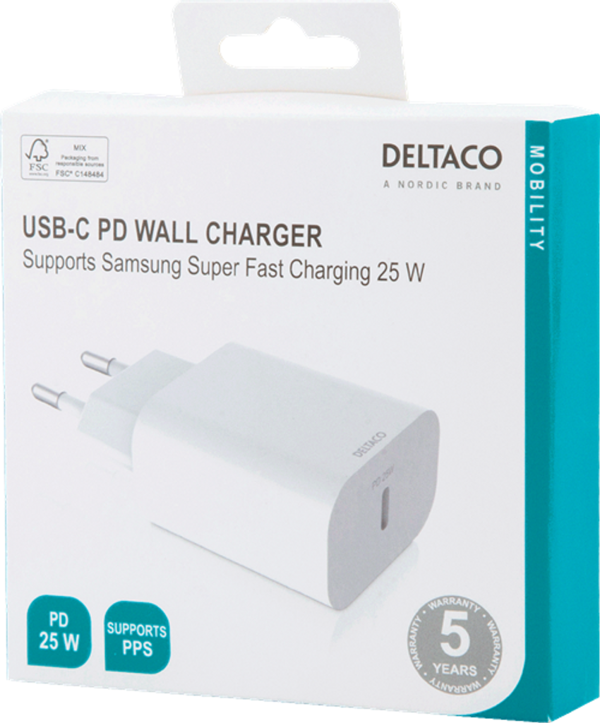 Liten och kompakt USB-C väggladdare med Power Delivery och PPS-teknologi för snabb och effektiv laddning av alla dina mobila enheter.