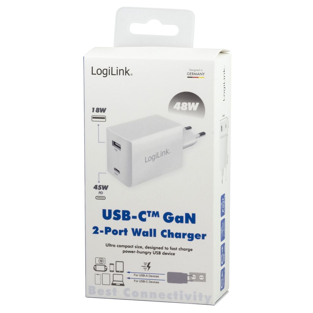 LogiLink Kompakt USB-laddare med 1x USB och 1x USB-C PD på totalt 48W med GaN-teknologi
