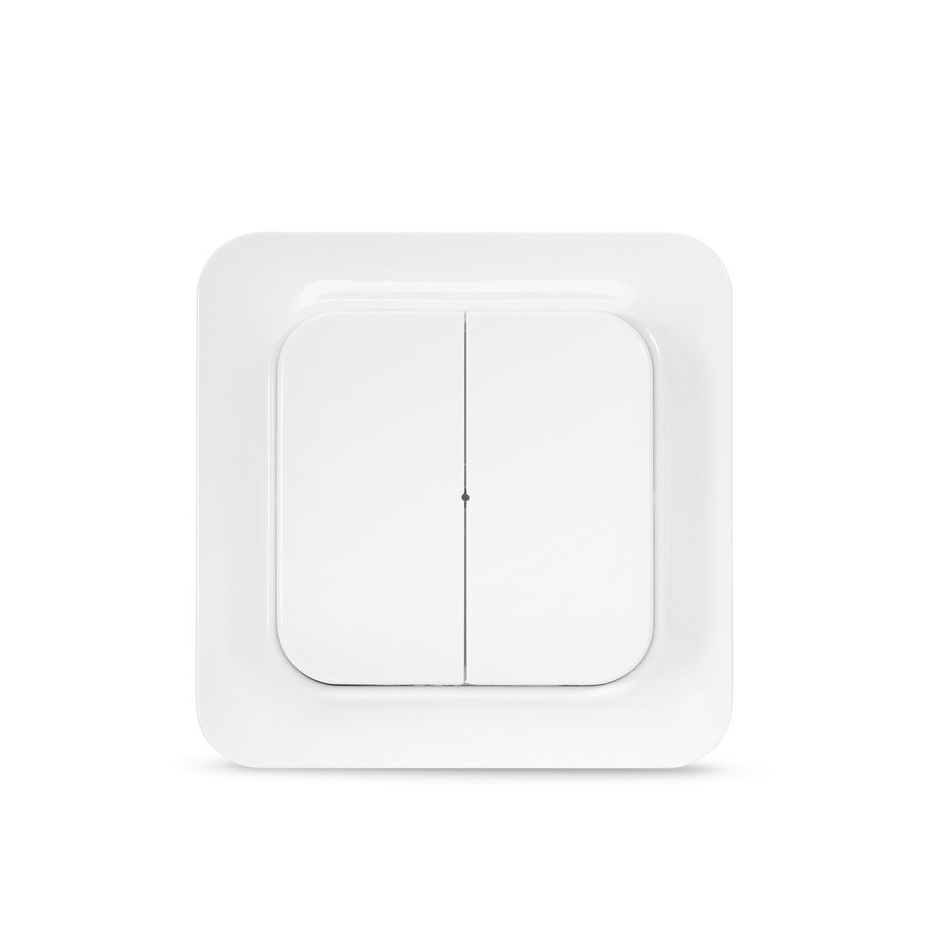 Wireless wall switch with frame and buttons that match Eljo Trend.