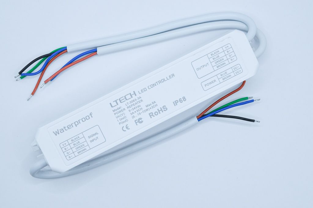 Beskrivning av Vattentålig förstärkare till RGB-lister Perfekt om du ska dra längre mängder vattentåliga lister i till exempel våtrum eller pool.